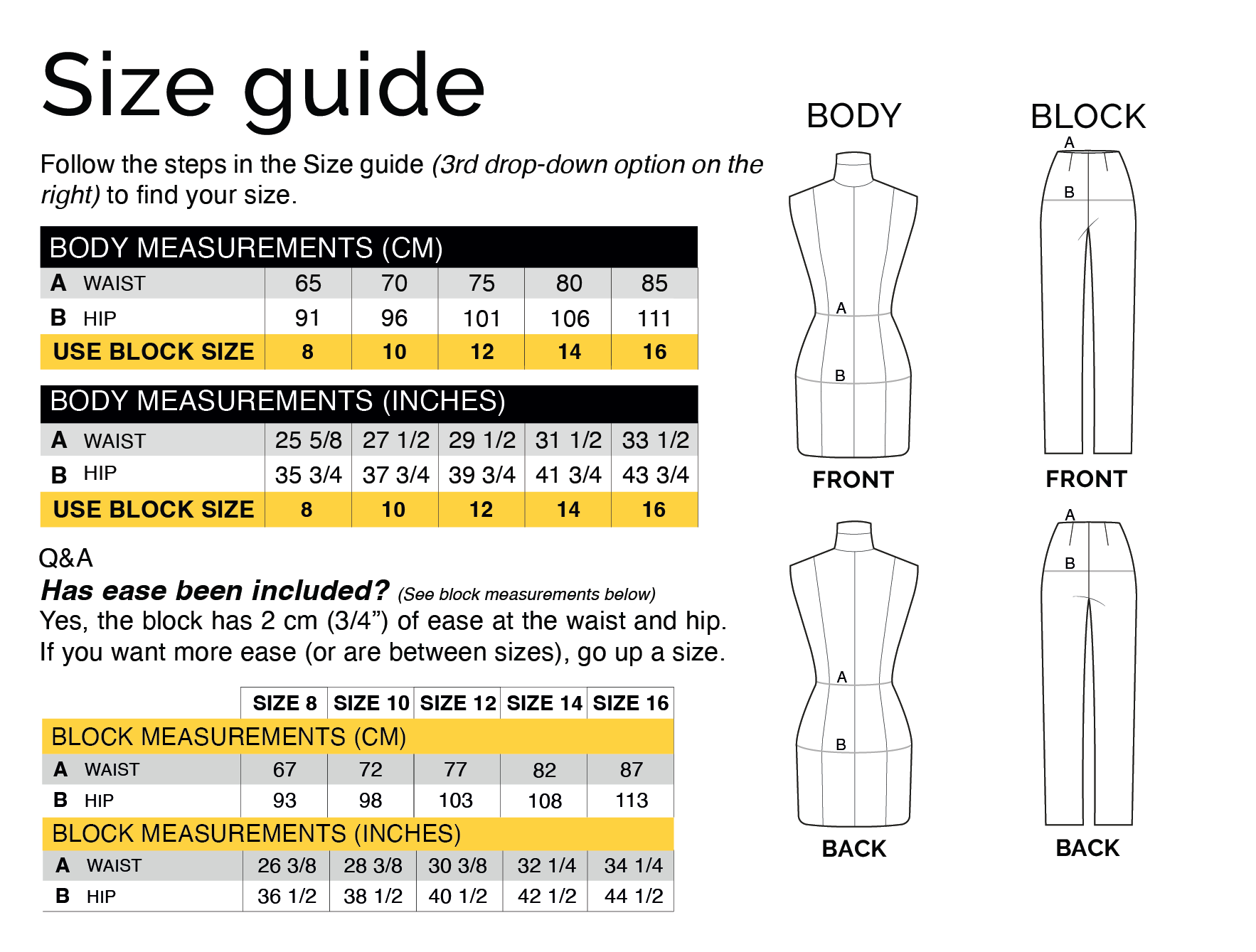 All 3 blocks are fitted between the waist and hip with 2 cm (3/4") of built-in ease to allow comfort and movement.